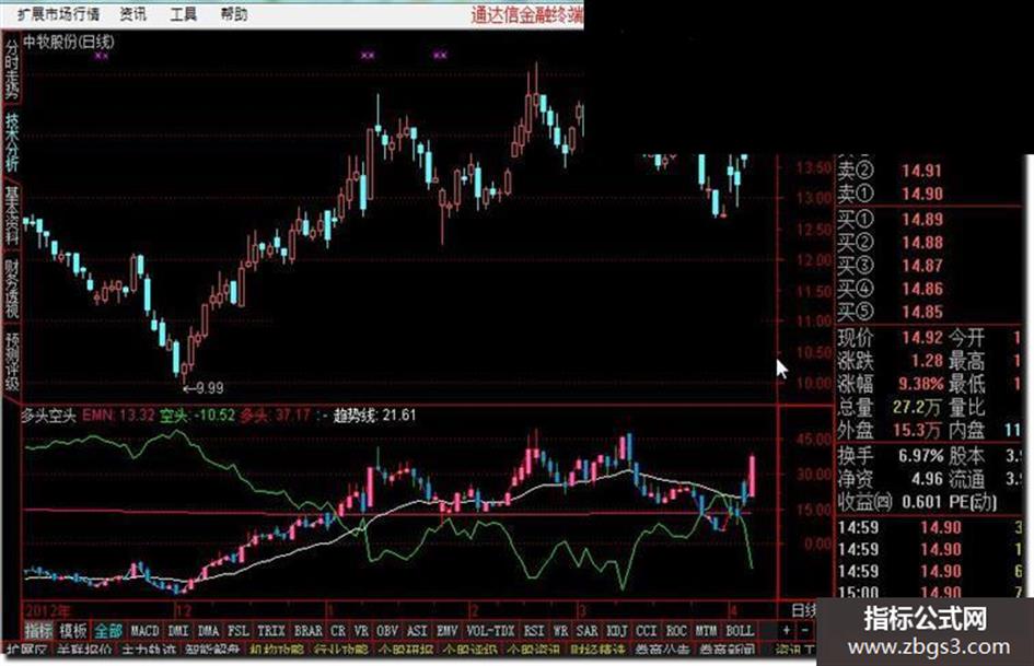 为答谢大家的厚爱,再发悲欢离合主图的姊妹篇,多头空头副图指标,关注多空线,及K线与趋势线,0轴和EMN线的关系。