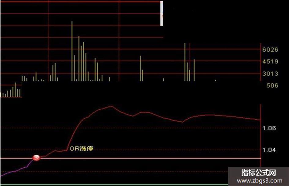 DRAWTEXT(CROSS(EXPMA((DCLOSE/TOU),20),1.04),1.04,'OR涨停'),COLORYELLOW;