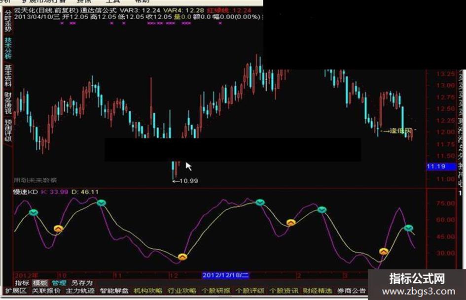 {慢速KD} N:=9;M:=3;MM:=5; RSV:=(CLOSE-LLV(LOW,N))/(HHV(HIGH,N)-LLV(LOW,N))*100; FASTK:=SMA(RSV,M,1); K:SMA(FASTK,M,1),LINETHICK1,COLORMAGENTA; D:SMA(K,MM,1),LINETHICK1,COLORYELLOW; DRAWICON(CROSS(K,D),K,34); DRAWICON(CROSS(D,K),D,35);