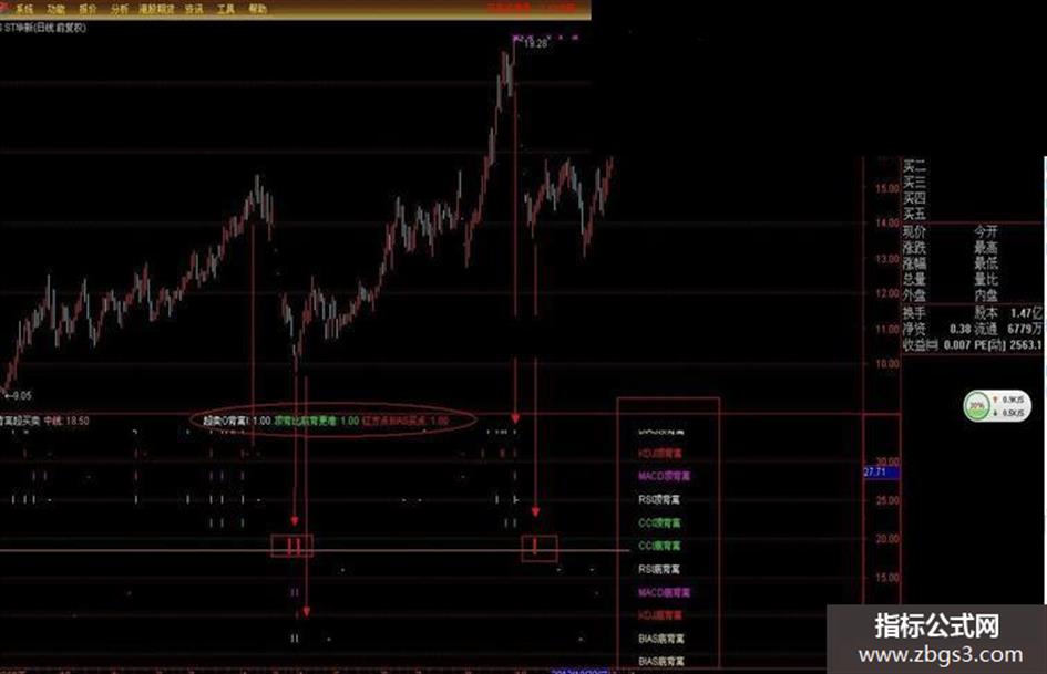 再后来就是:背离之后还有背离。。。一般来说。顶背离比底背离来的可靠下。。那么怎么判断有没背离呢?我自己弄了一个指标。。里面包括kdj, cci, bias,macd等等几个常用指标的背离。