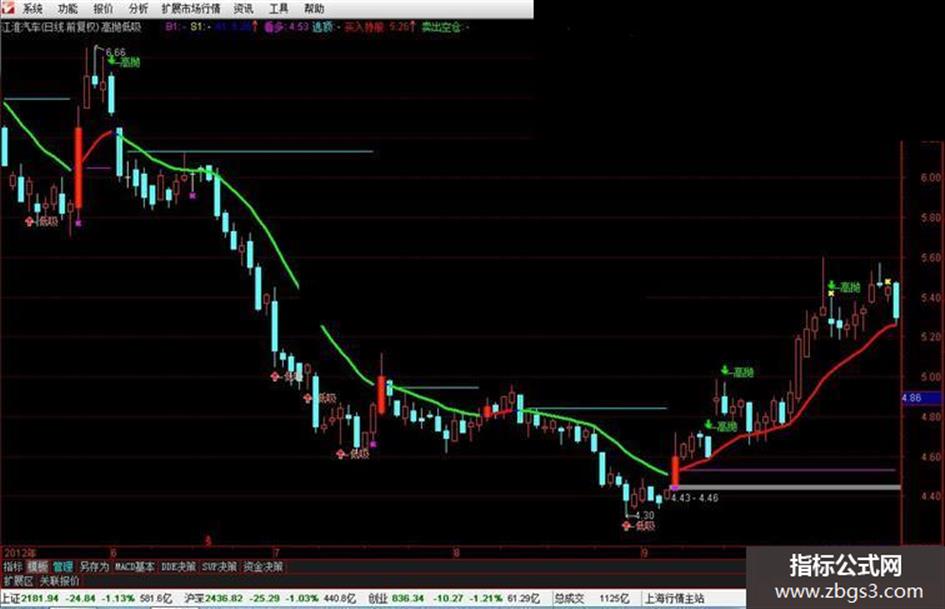 DRAWTEXT(CROSS(庄家,散户) AND 散户>70,H+0.05,'←高抛'),COLORGREEN;