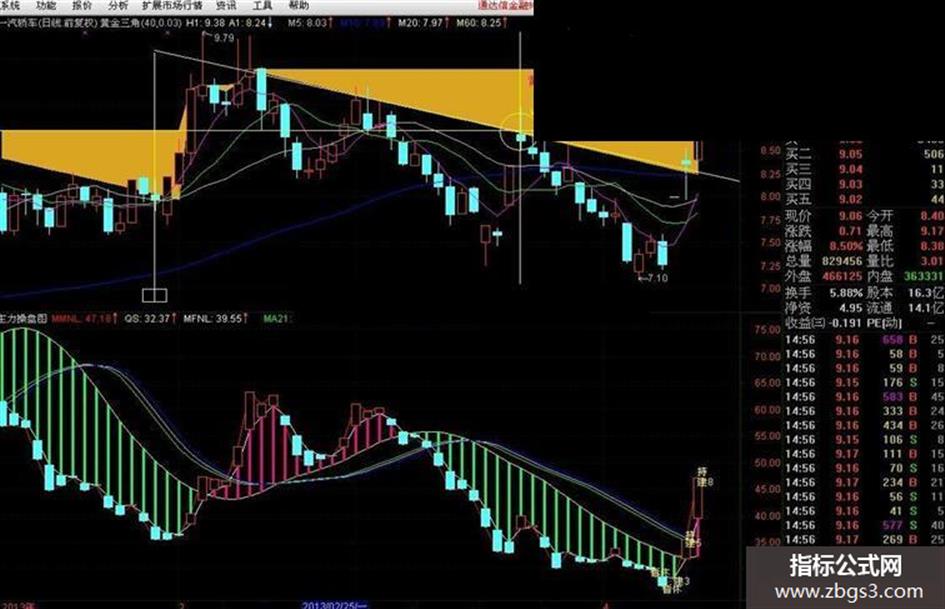 在指数长期下跌后,我们可以通过寻找那些领先于指数底部抬高的个股,这些个股往往是主力资金提前布局的股票,找到这样的股票以后,我们就找到它底部打桩区间的一个高点做为原点,通过这个原点与一个近期的历史高点做线,得到一根杠杆,另外一根杠杆就是这个原点底部区间的高点连线或者就是通过它做的水平线。股价要上涨,必须突破这两根杠杆,只要股价放量突破这两根杠杆,那么这两根杠杆就能够撬动股价向上喷发,在突破之后可能会出现缩量反压杠杆的情况,这是逢低吸纳的良机!