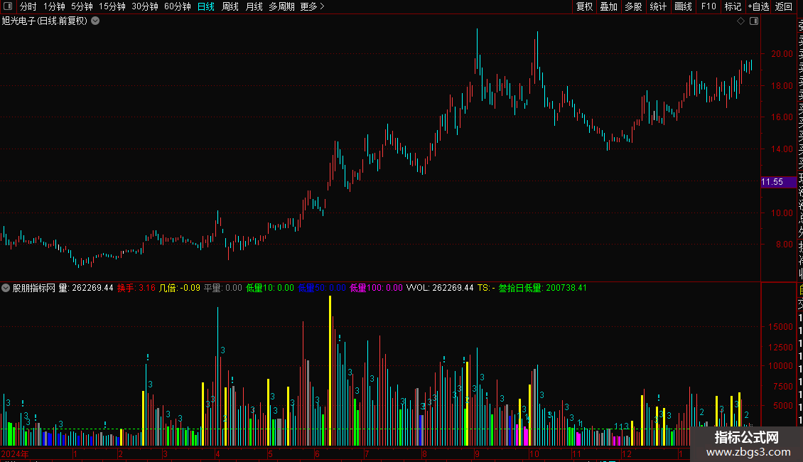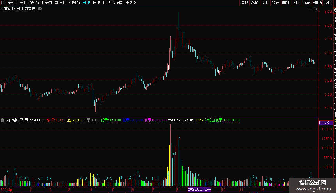1. 绘制成交量柱,并用不同颜色标记倍量、平量、以及10/50/100日低量。
