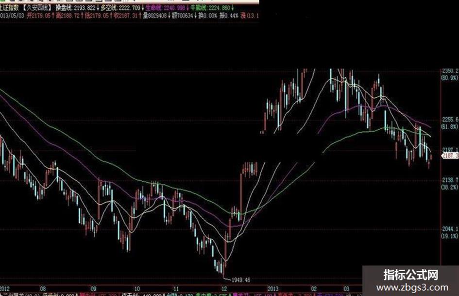 L1:=ref(L,1);C1:=ref(C,1);H1:=ref(H,1); CHL:=(C1+H1+3*L1)/5; 操盘线:EMA(CHL,9); 多空线:EMA(CHL,27); 生命线:EMA(CHL,54); 牛熊线:EMA(L1,90);