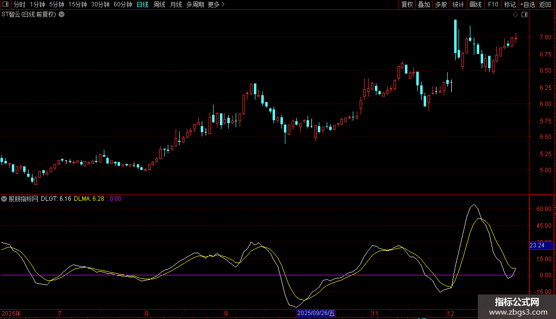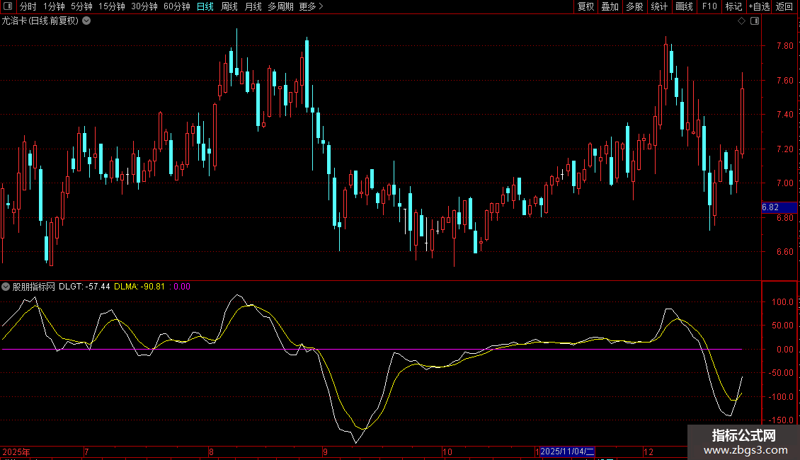 2. DLMA:这是DLGT线的3日简单移动平均线(经过SMA函数平滑),用于反映DLGT的短期趋势,平滑波动,便于观察方向。