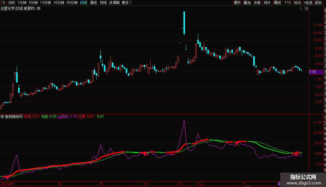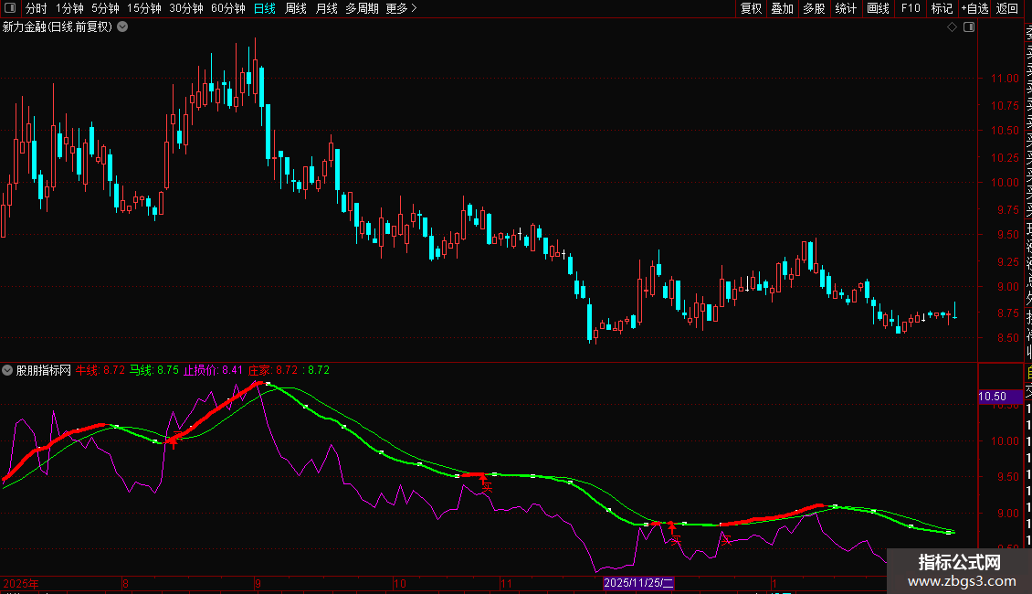4. 庄家线:其算法与牛线完全相同,但通过红粗(上涨)、绿细(下跌)的线型变化,直观显示短期趋势的强弱方向。