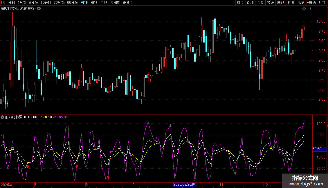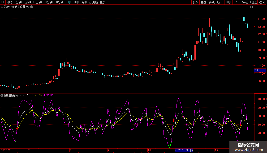 - J线绿色加粗段:当J值小于0时,仅显示J线且转为绿色加粗,否则不显示。