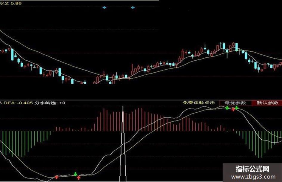 选股 分水1:=(EMA(CLOSE,5)*7+EMA(CLOSE,10)*3)/10; 分水2:=DMA(EMA(CLOSE,12),SUM(VOL/CAPITAL,5)/3); 分水岭选:CROSS(分水1,分水2);