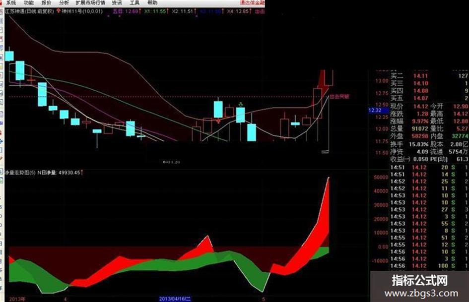 用法:结合净量走势图,股价上穿一条支撑线建仓三成,突破压力线加仓,突破出击线持股