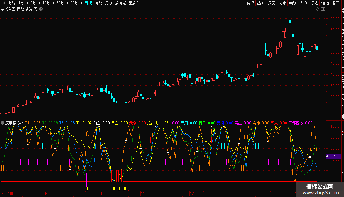 2. 七剑信号系统:定义了七种不同的技术形态(如“白金”、“黄金”、“天瀑”等),每种形态由多个条件(如不同周期指标间的交叉、超买超卖状态)组合触发,并在副图以彩色柱状图直观显示。