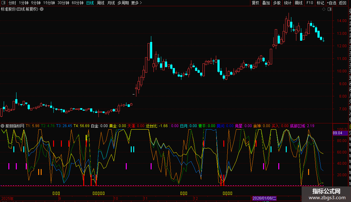 主要观察彩色信号柱的出现,不同颜色代表不同的技术形态,可结合其他分析判断其强度。