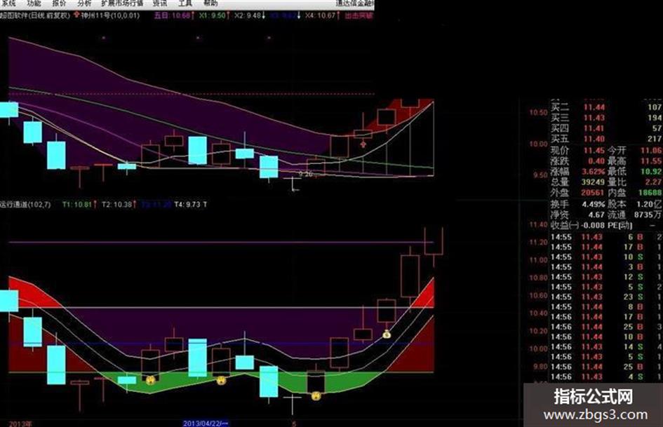 T3、T4是重心线比20日均线涨幅的动态值的上下7%波动的线;