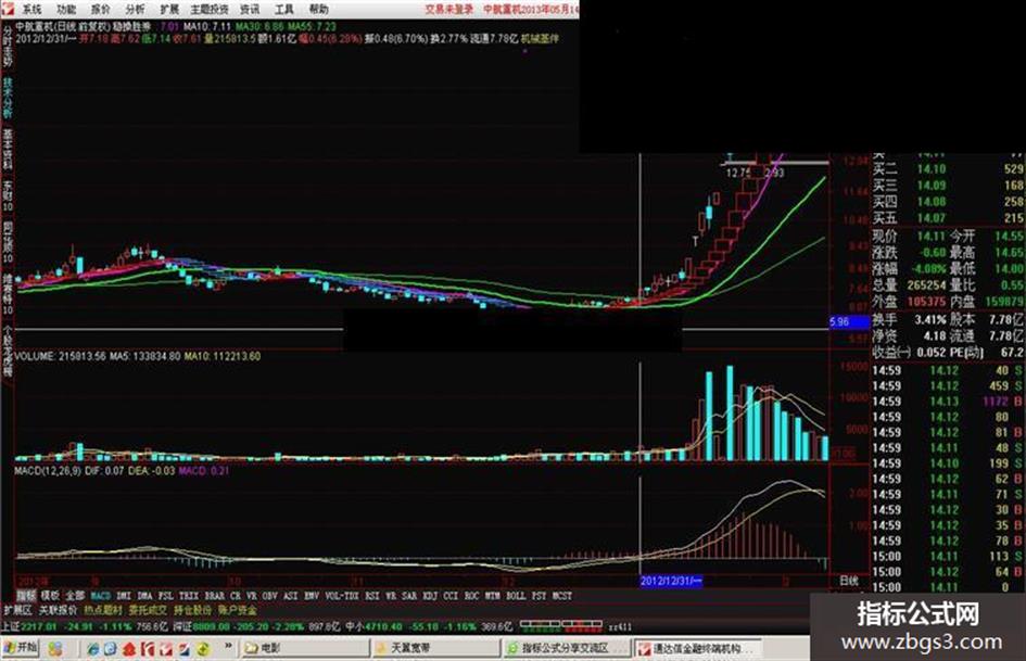 用法:当均线趋向多头排列,红方块逐渐变大时,若量能温和放大,且MACD即将上穿零轴或已经上穿零轴,即可买入;只要红方块没变蓝,就可继续持有,这样可以避免K线等其他指标的干 扰,骑的稳,拿得住。 当变为蓝方块,可考虑波段操作,卖出部分或全部筹码,若此时大盘向好,而个股均线系统还呈多头排列,也可继续持股,进行中长线操作,会有较大收益。 结合2012年12月大盘向好,我抓住了维科精华一波走势,目前我感觉第二波又来了,你说呢?