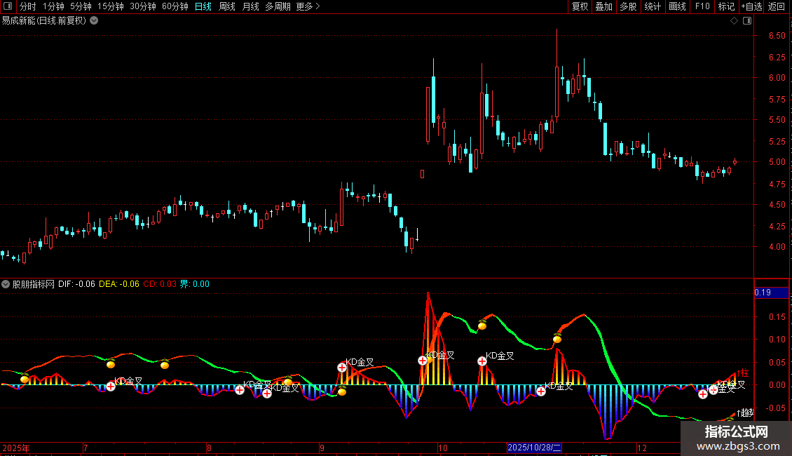 3. CD:计算DIF与DEA差值的7倍放大值,作为柱状图(MACD柱)的基准,红色粗线显示。