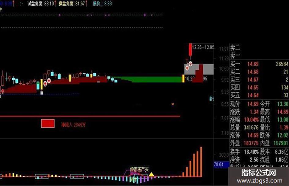 指标中如果出现紫柱跟蓝柱交替,就是空头趋势,此时只要两个柱体交错,我们坚决不拿股票,说明空头趋势已经降临,任何时候,买入股票都是错误的,如果是红色柱体跟黄色柱体交错的话,说明此时股票还是多头趋势,在多头趋势的情况下,我们任何时候持有股票都是正确的。如果在指标当中,出现各个字体标注,如果是疯牛,或者倾家荡产买股票等字眼,说明此时我们应该高度重视,这个时候,很容易变盘,如果出现柱体交换的话,我们就可以买入股票!!但是一定要遵循市场的原则,红色柱体跟黄色柱体消失之后,要毫不犹豫的卖出股票!!此指标的重点就在于通过四个柱体的颜色,我们来判断多空趋势,仅仅是判断多空趋势以及大盘强弱的指标,而非买卖点的指标