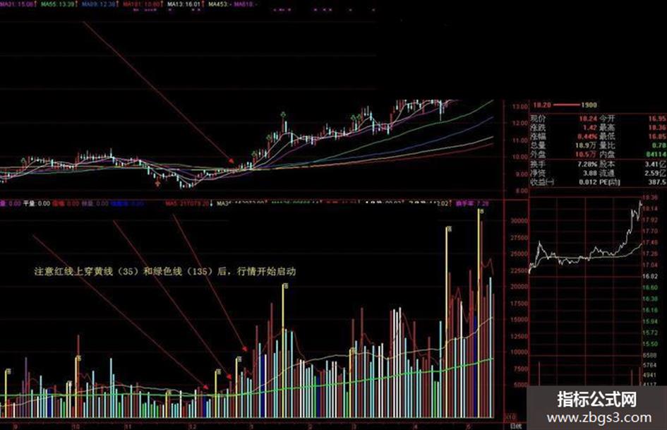 当5日红线35黄线上穿135日绿粗线的时候,行情确立开始启动 。。。当量柱在35日黄线的下沿。。说明是主力在洗盘,吸筹中。。。