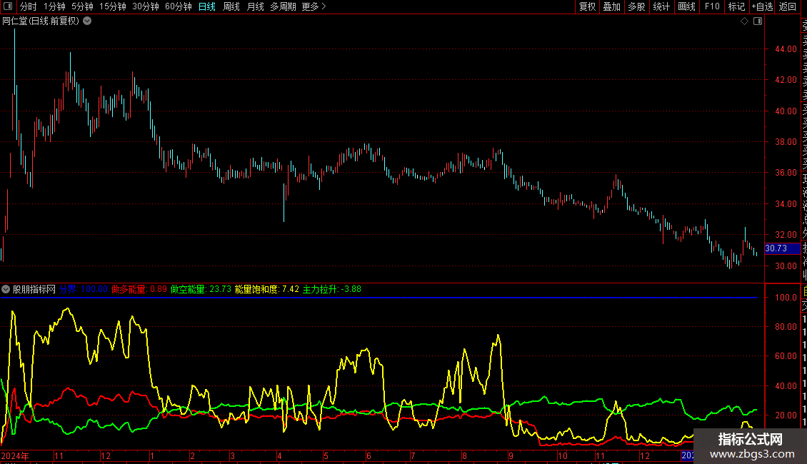 指标包含多个子指标,用于分析市场多空能量和主力行为。