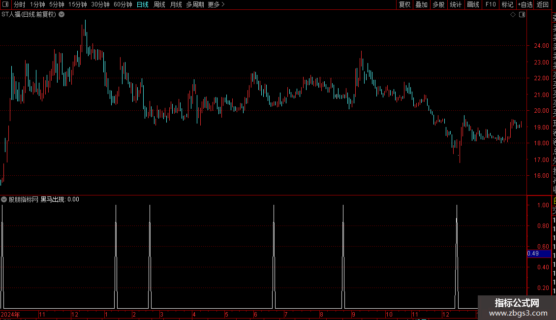 黑马出现:RR AND NOT(REF(RR,1)) AND (RR1<-100 AND BB1<-100) AND CB1<-100 AND VAR19=1;