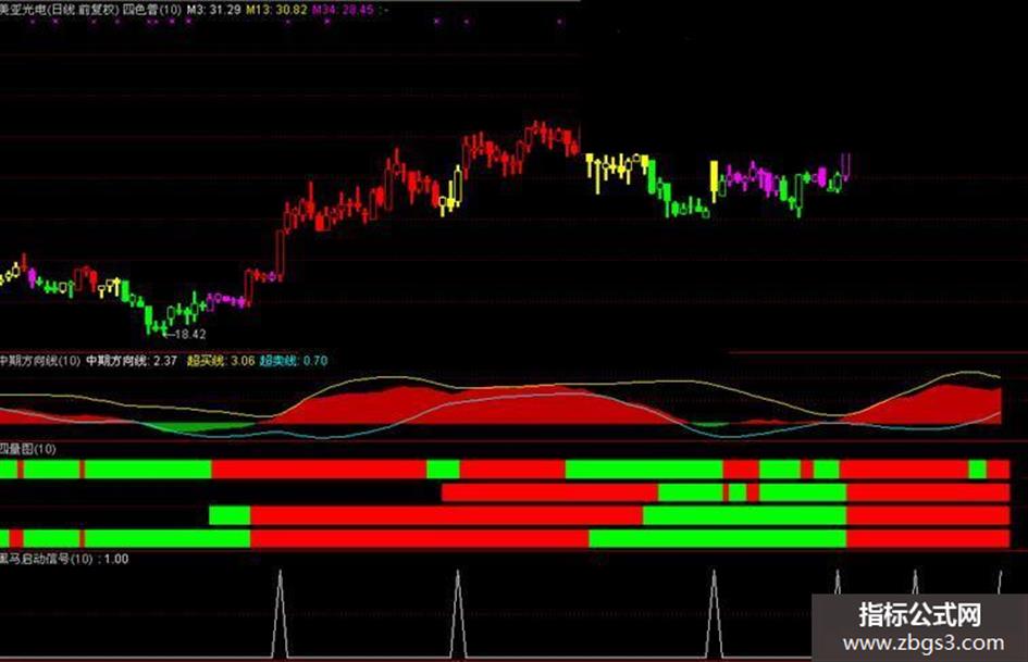 四色谱(精确度约98%): 指标应用法则: (1)紫色K线-----建仓-----持仓资金比例20%~30%。 (2)红色K线-----增仓-----持仓资金比例60%~以上。 (3)黄色K线-----减仓-----持仓资金比例20%~30%。 (4)绿色K线-----清仓-----持仓资金比例0%。 红色持股,绿色持币,紫色反弹,黄色调整。
