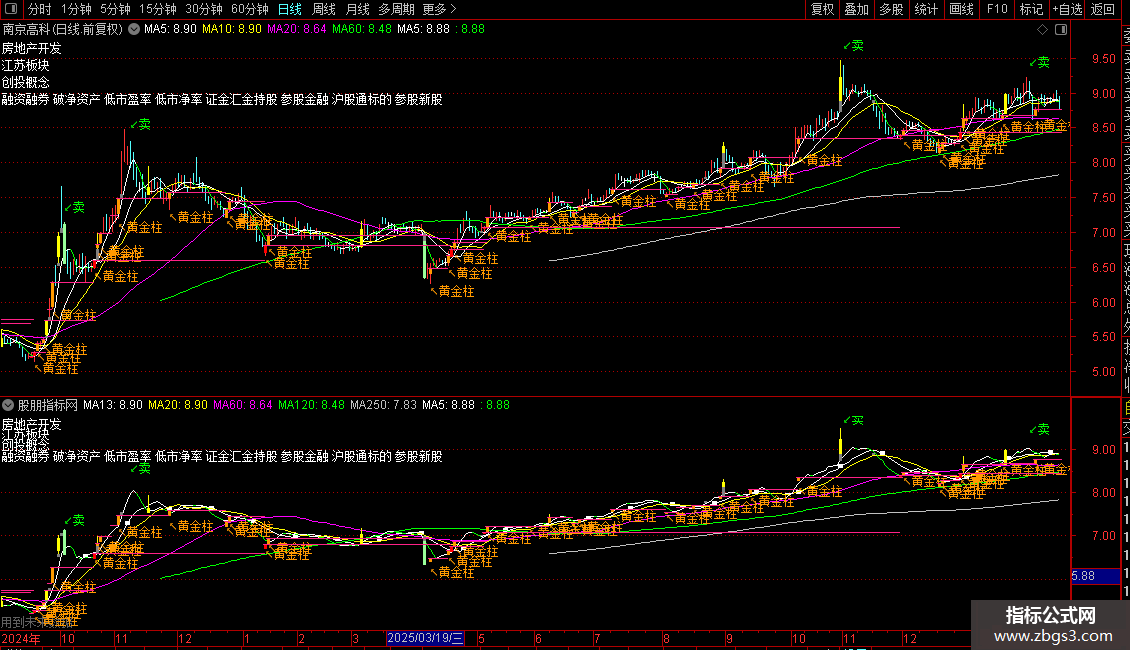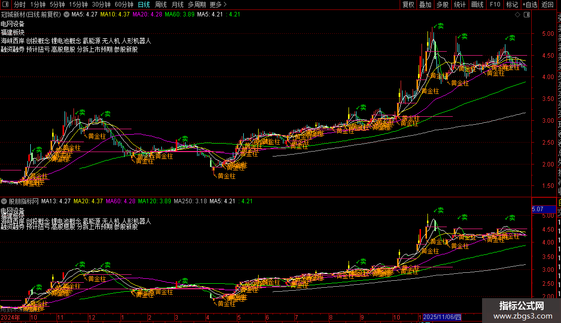 4. 核心功能 - “黄金柱”识别:基于“量学”理论,通过复杂的量价关系(如价升量缩、均价抬升、不破基柱顶底等)条件,自动识别并标记出多种类型的“黄金柱”和“元帅柱”,并用不同颜色(如蓝色、深蓝色)在K线上进行标注和文字提示。