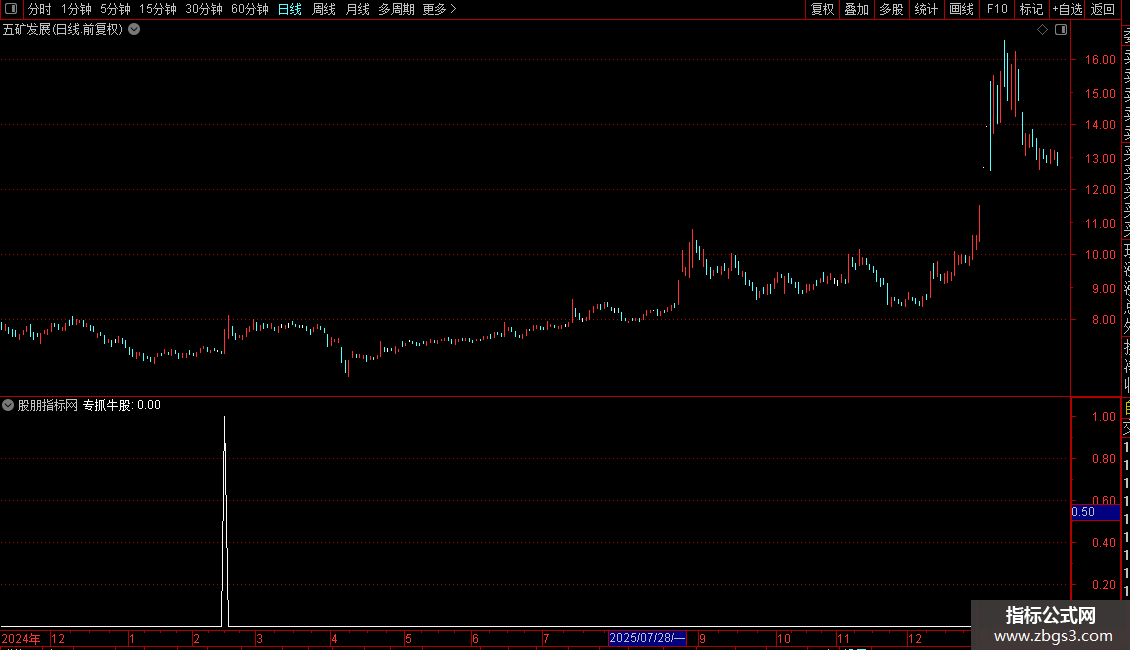 指标名为“专抓牛股”,是一个综合性的选股公式。它通过整合多种技术条件来筛选潜在的强势启动股。