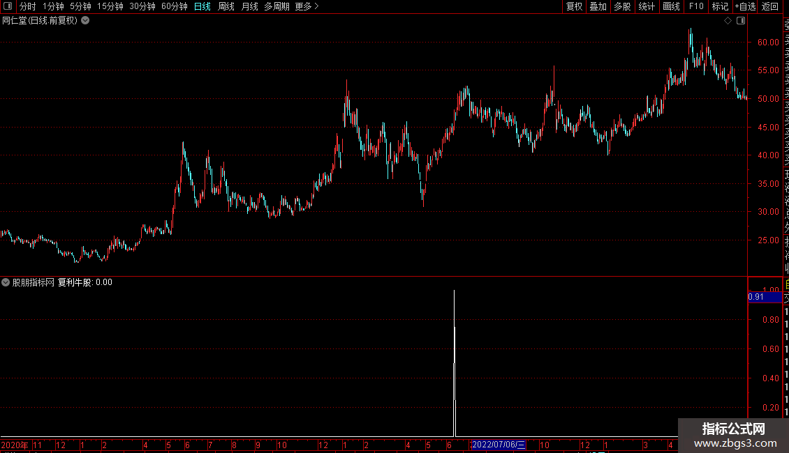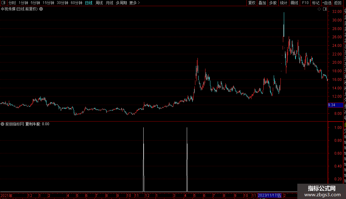 指标名为“复利牛股”,是一个综合性的选股公式。它通过整合多种技术条件来筛选潜在强势股。
