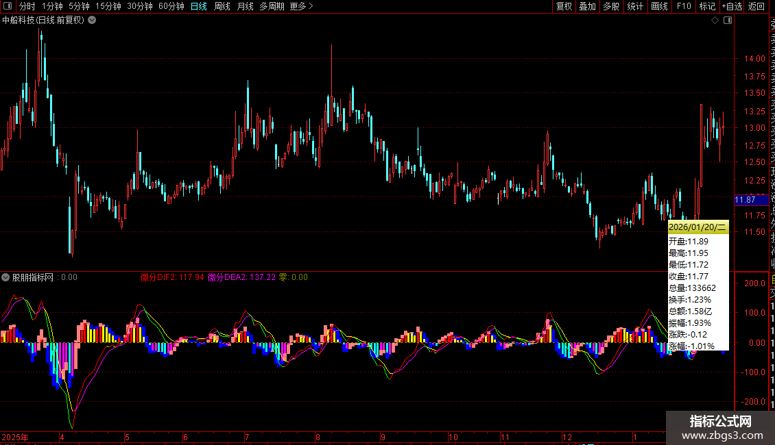 趋势判断:关注“微分DIF”与“微分DEA”的金叉死叉,以及MACD2柱状图在零轴上下和颜色的变化。