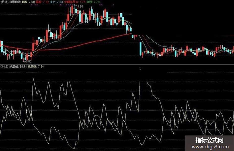 取自于系统的一个常规指标,在使用中感觉线束太多而影响视线,尝试化繁为简后留下最为适用的两条线.白线为抄底线,黄线为逃顶线. 参数设置: 1为N 最小为2.00 最大为90.00 缺省为14.00 2为MM 最小为2.00 最大为60.00 缺省为6.00 使用方法: 当白线在下和黄线形成对角尖角时为抄底时机; 当黄线在下和白线形成对角尖角时为逃顶时机; 对角时对得越直准确度越高,需自己慢慢体会,如在结合其老师的趋势指标则更为准确.仅在此大家切磋.