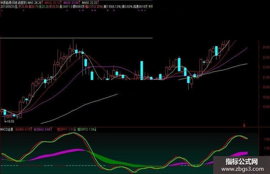 指标可取名为MACD全景,图中的色块部分即长线部分,二条线即短线部分,在长线色块为红色时,如短线二线金叉或刚金叉不久则可大胆做多,这时胜算会较大.