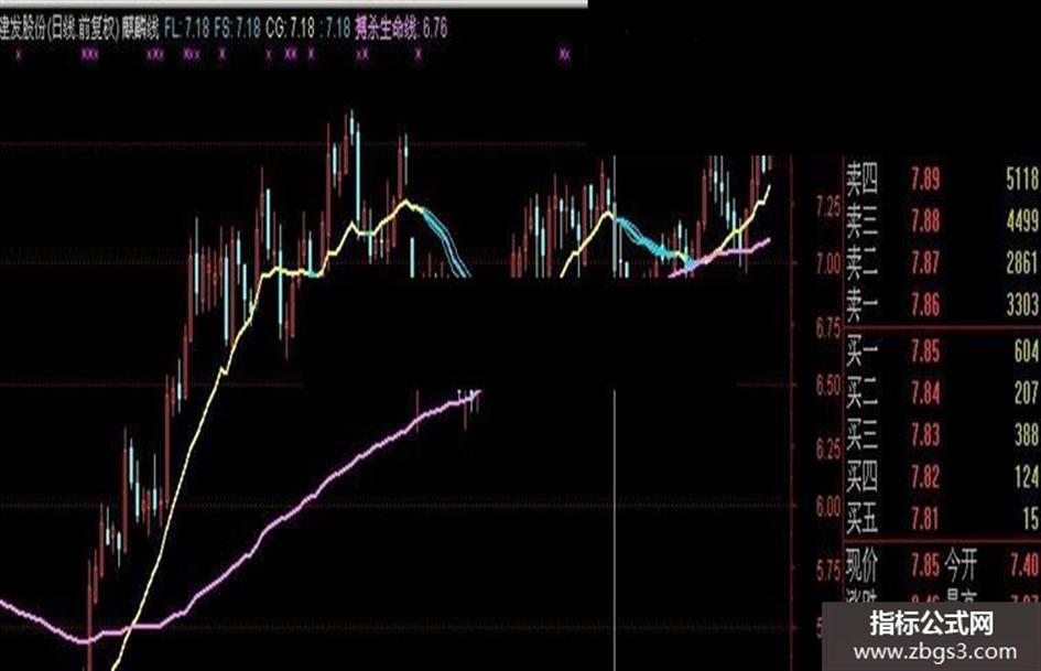 搏杀生命线:IF(VAR5/REF(VAR5,1)>1.1 OR VAR5/REF(VAR5,1)<0.9,VAR6,VAR5),COLORFF80FF,LINETHICK2,;