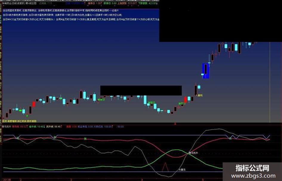 简要说明:骑上你的马(走骑马线哟),沿着“找牛线”交叉就能找到牛!要防偷牛贼沿着“偷牛线”跑哟,“偷牛线”上拐上升就意味着你要换股再找牛啦!三线交汇、发生大起爆-----既找到了牛也抓到了贼!(选股公式中有两组:你可以分拆分别选股,前面是大牛,后面是小牛,一起选大小牛也行),50为强弱线,上强下弱啦