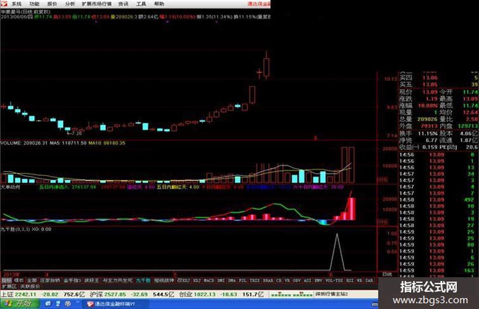 用收费数据可以看的大单动向,红柱子越大越好,指标中的那条线,由绿变红买入,由红变绿卖出,简单操作,红线持股,绿线持币。指标只是参考,选股才是核心,我的选股每一个都有未来函数,不要问我索取