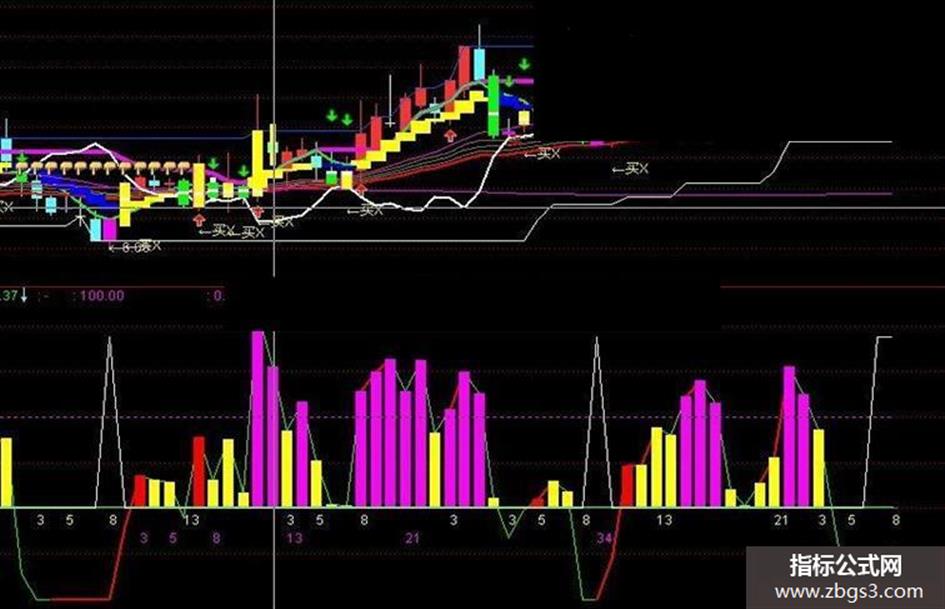 买点:=IF(CROSS(J18,J2),5,10*1000),COLORFF00FF,LINETHICK2;