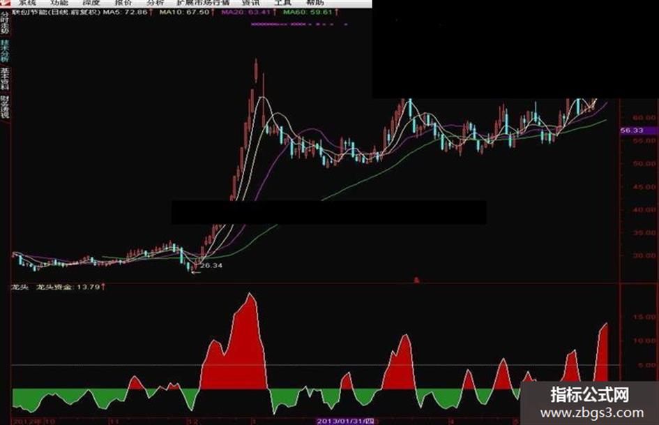 用法有三:1、主力先进行打压吸筹,然后大幅拉升,2、先直接拉一段,洗盘,然后再拉,3、龙头资金若在0轴下方,就是下跌,一直处于绿色,定是没有资金关注,即使涨也涨幅不大,只要龙头资金翻红,必会短期出现大幅拉升!若能上穿上方虚线(是异动),必定因涨停出现或大幅拉升!直接看图观察吧。公式绝无未来,可放心使用!