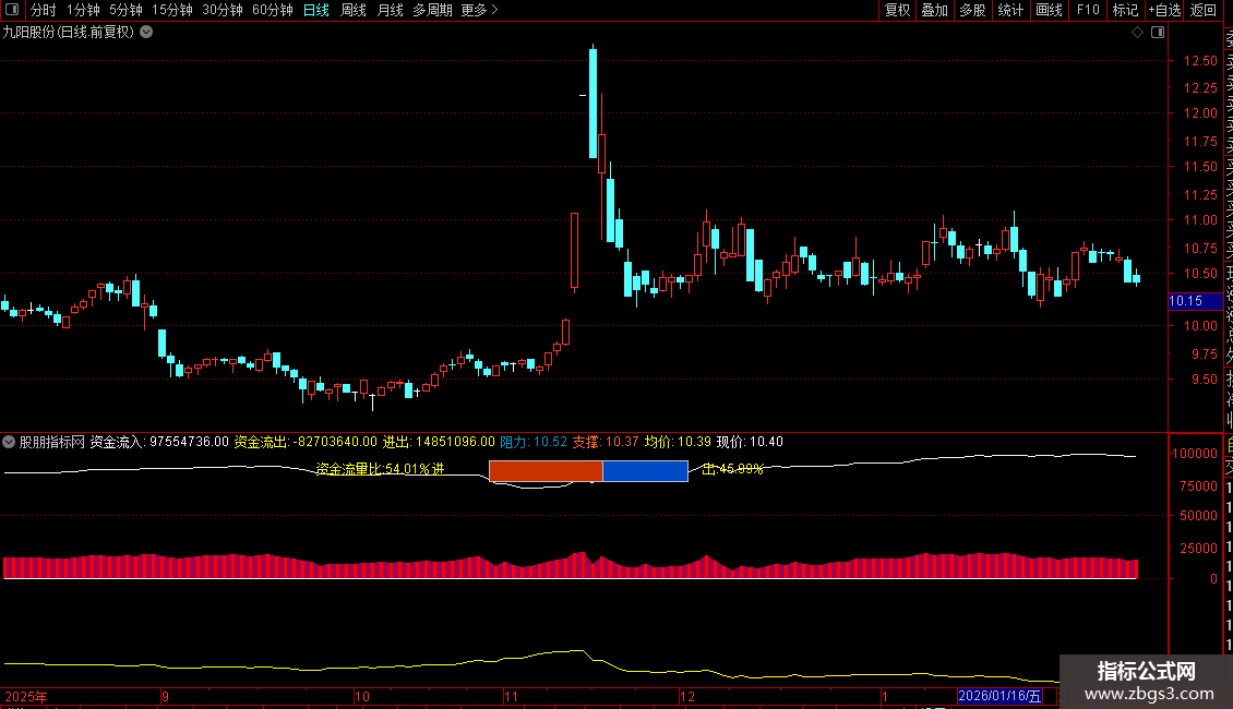 4. 柱状图:根据“进出”值的正负,在副图上绘制红柱(净流入)或青柱(净流出)。