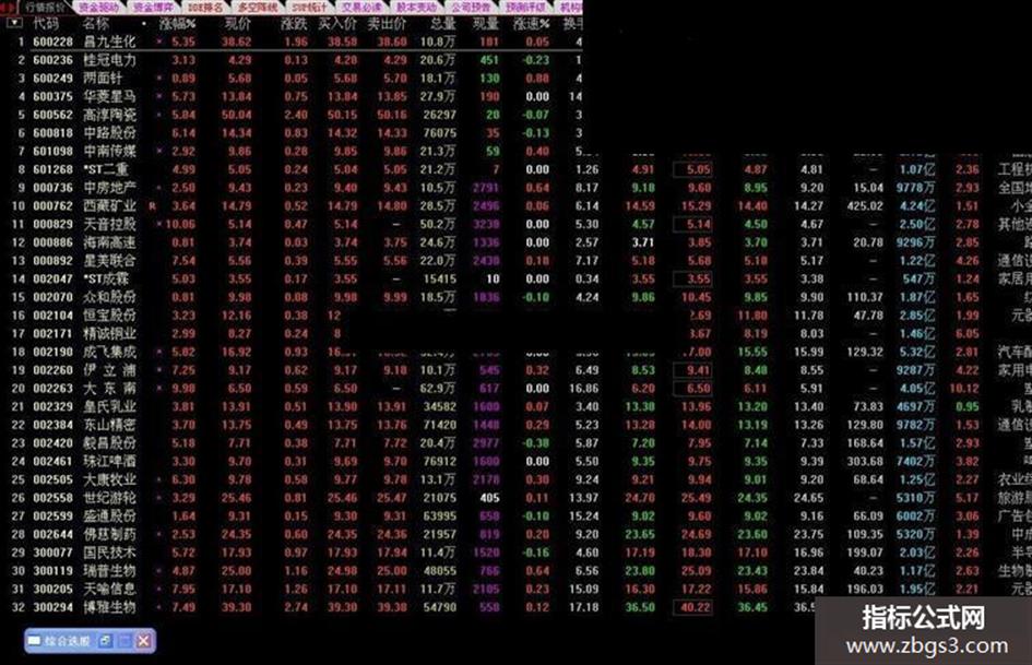 M21:=MA(C,21); M55:=MA(C,55); A0:=M21>REF(M21,1) AND M55>REF(M55,1); A1:=COUNT(V>REF(V,1),2)>=2; A3:=KDJ.K>KDJ.D; A4:=MACD.DIF>0; A5:=CCI.CCI>100; A6:=C>BOLL.BOLL; {ST:=IF(NAMELIKE('S'),0,1) AND IF(NAMELIKE('*'),0,1);} S2:=DYNAINFO(4)>0; A0 AND A1 AND A3 AND A4 AND A5 AND A6 AND S2;