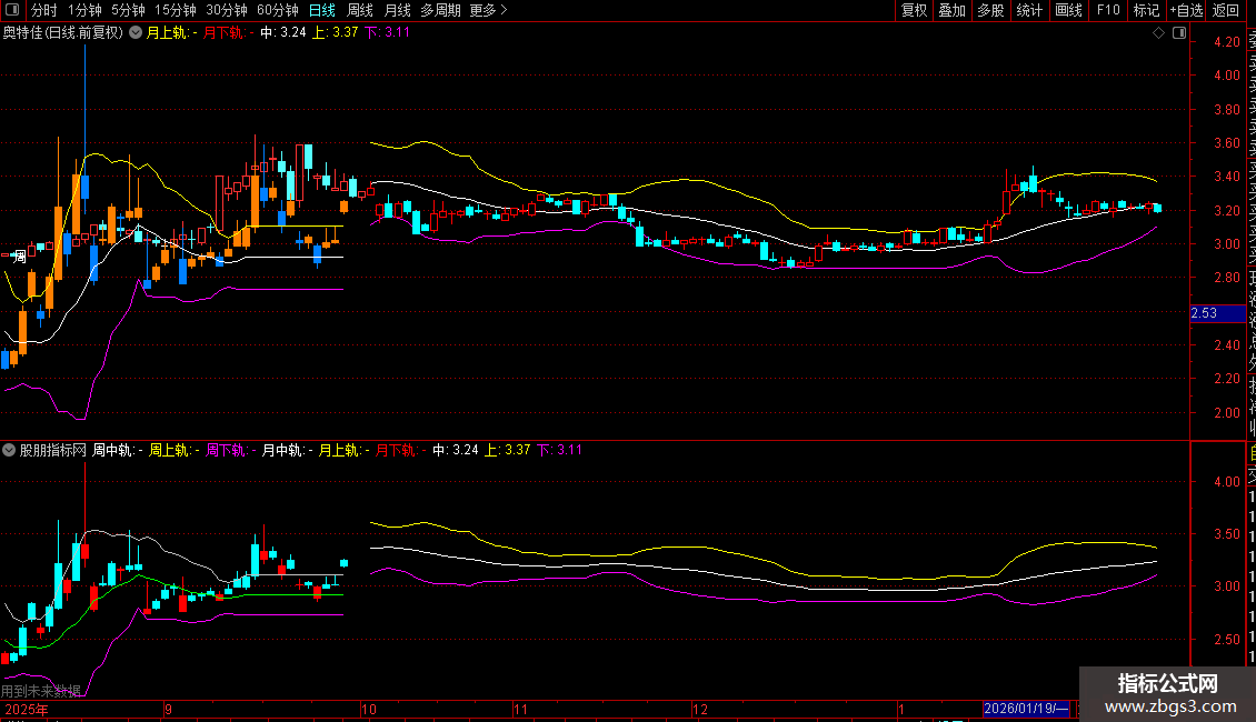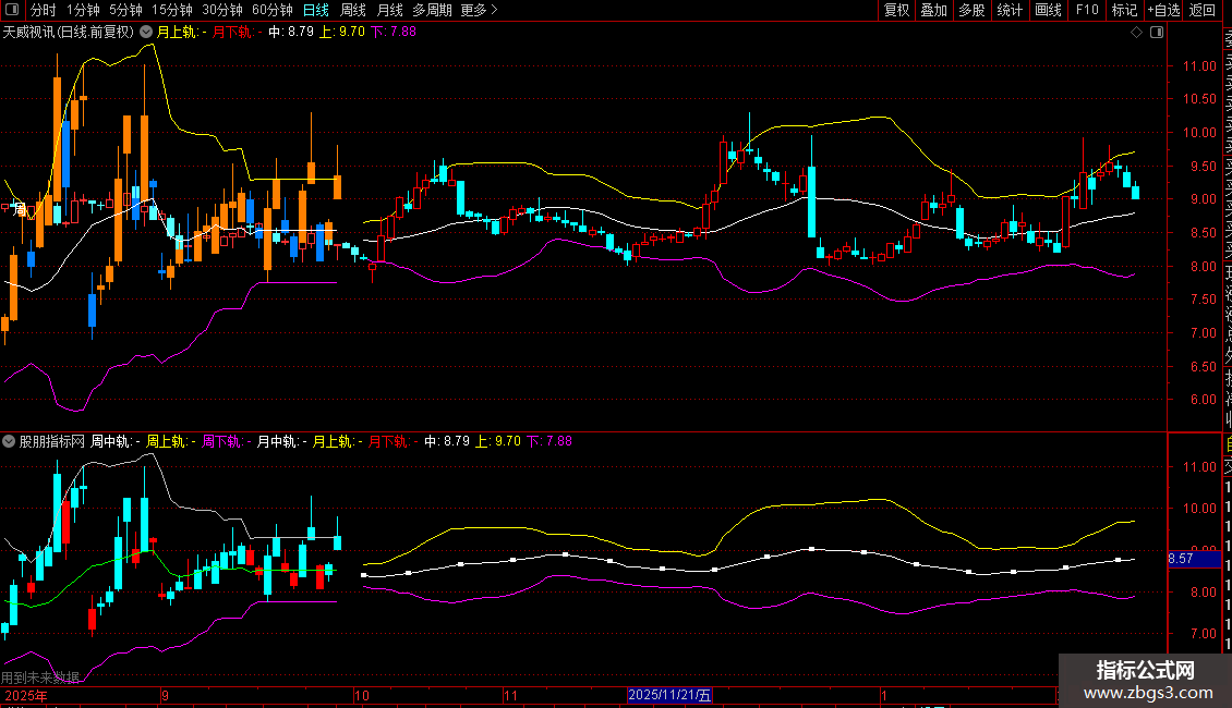 指标在日线图上叠加显示周K线、月K线及其对应的布林带轨道线,并在日线图右侧特定位置标注“周”、“月”文字。
