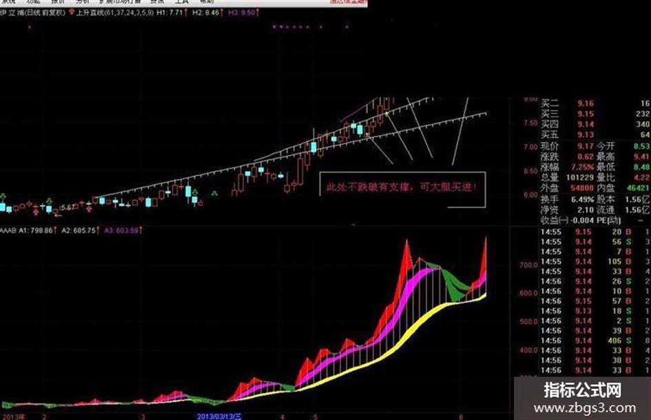 定义:两个相邻的高点的连线叫内径线。 实战意义:每根线突破了是支撑,可大胆买进; 未突破是阻力,小心被套。跌破了更要清仓走人。 参数可调。不会用的,请按图中我的参数试试。 看图: