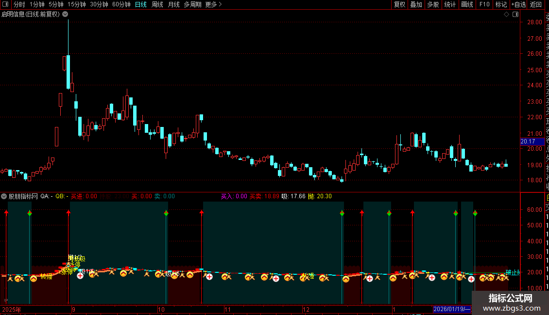 买/卖:基于QA、QB两线的相对位置变化(金叉、死叉)产生明确的买入(红色向上箭头)和卖出(绿色向下箭头)图标信号。