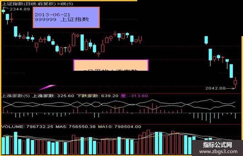 :MA(INDEXADV,N); 下跌家数:MA(INDEXDEC,N); 差:-下跌家数,COLORSTICK;