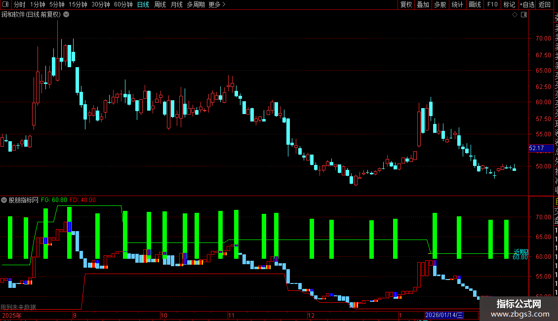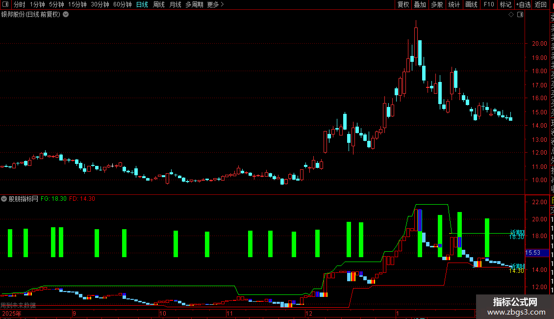 3. 绘制支撑与阻力线:通过`PEAK`和`TROUGH`函数,绘制基于前期高点的绿色阻力线(FG)和基于前期低点的红色支撑线(FD)。