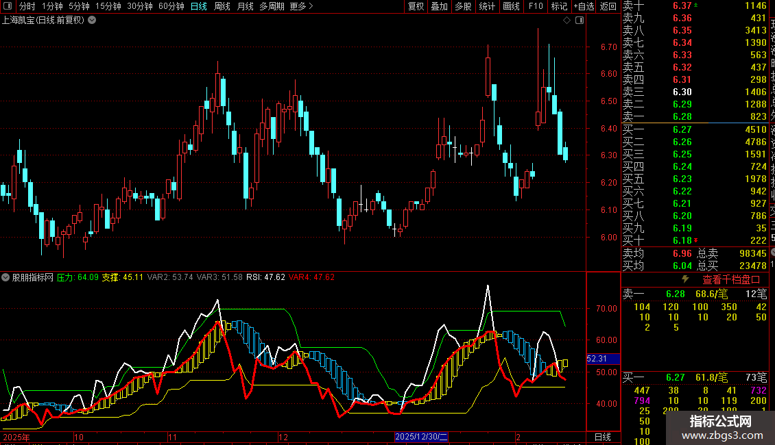 2. 压力与支撑:通过计算RSI的3日均线在13日内的最高值和最低值,形成动态的压力带(绿色)和支撑带(黄色)。