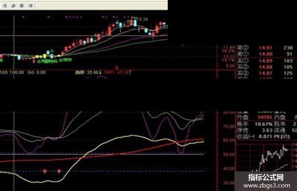 抢钱:DRAWTEXT(CROSS(中线2,-90) AND (长线<中线 AND 长线>REF(长线,1)OR 短线<20 AND 中线<20 AND 长线<20),长线,'黄金坑'),COLORFF00FF;