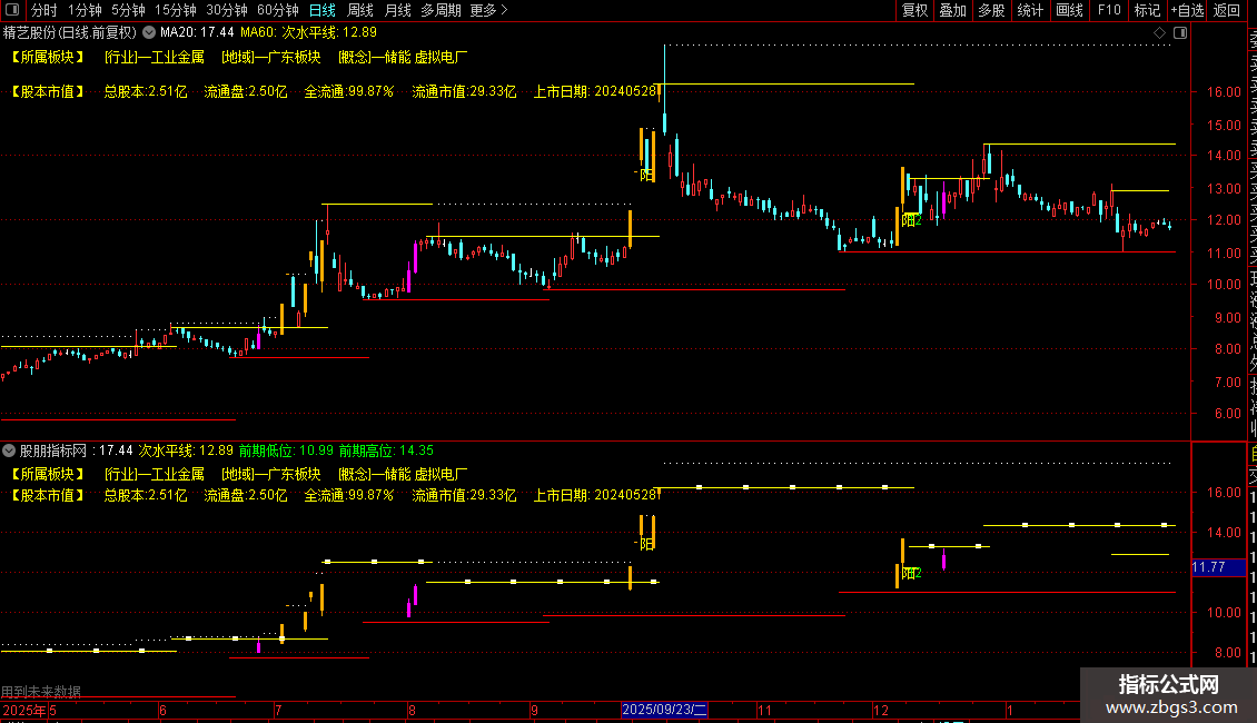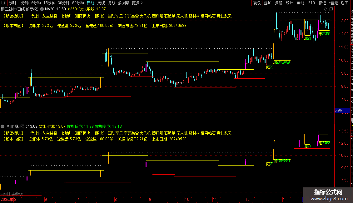 1. 信息看板:在K线图左上角固定显示个股的所属板块(行业、地域、概念)、股本数据(总股本、流通盘、全流通比例、流通市值)及上市日期。