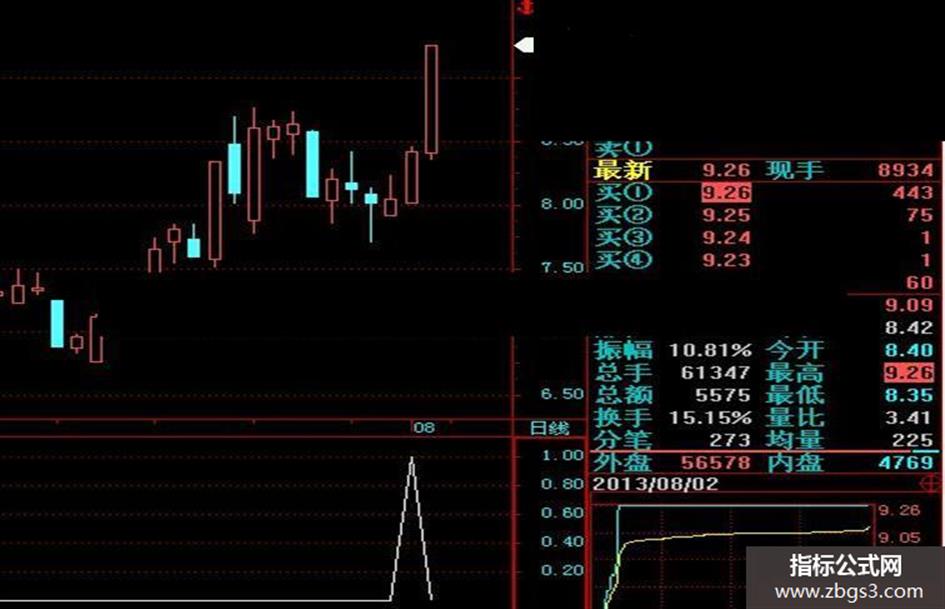 其实所有指标殊途同归,都是量价的变形,v,c,l,h,o,我就不相信没有指标不用到这几个函数的。。。。。。。 简单的事情不需要太复杂,抓住这几个函数就OK了。。 本指标通码,无未来,在此声明,本指标不是万能指标,请结合其他指标慎用,非喜勿下。 LS:=(H-REF(C,1))/REF(C,1)>0.04; TJ:=(MA(C,13)-REF(C,1))/REF(C,1)<0.02 AND CROSS(C,MA(C,13)); XG:LS AND TJ;