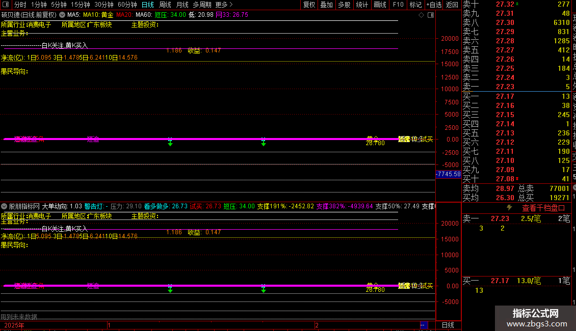 4. 资金流向可视化:通过计算“大单动向”,在K线实体内部用红绿渐变色柱状图直观显示大单资金净流入/流出强度。