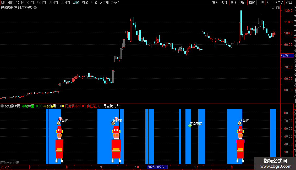 5. 状元郎:为“牛股出炉”信号匹配复杂的K线下方柱状图标和“状元人”图标,进行视觉强化。