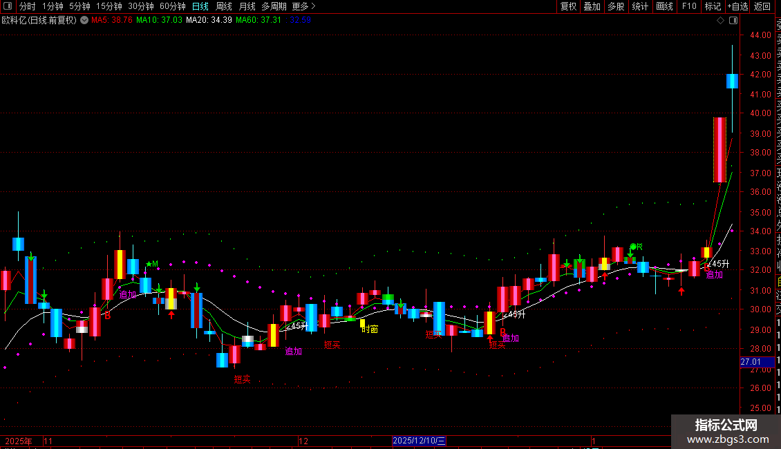 上:EMA(C,3),COLORRED,LINETHICK1;