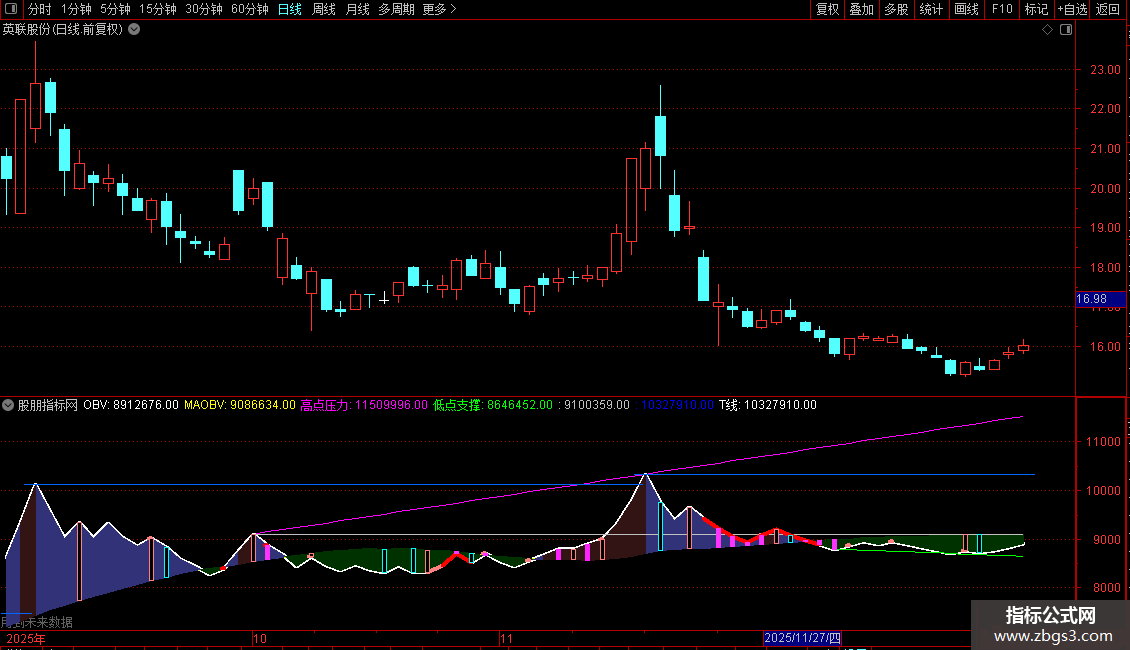T线:REF(OBV,BARSLAST(D1)),COLORFF00FF,LINETHICK0;
