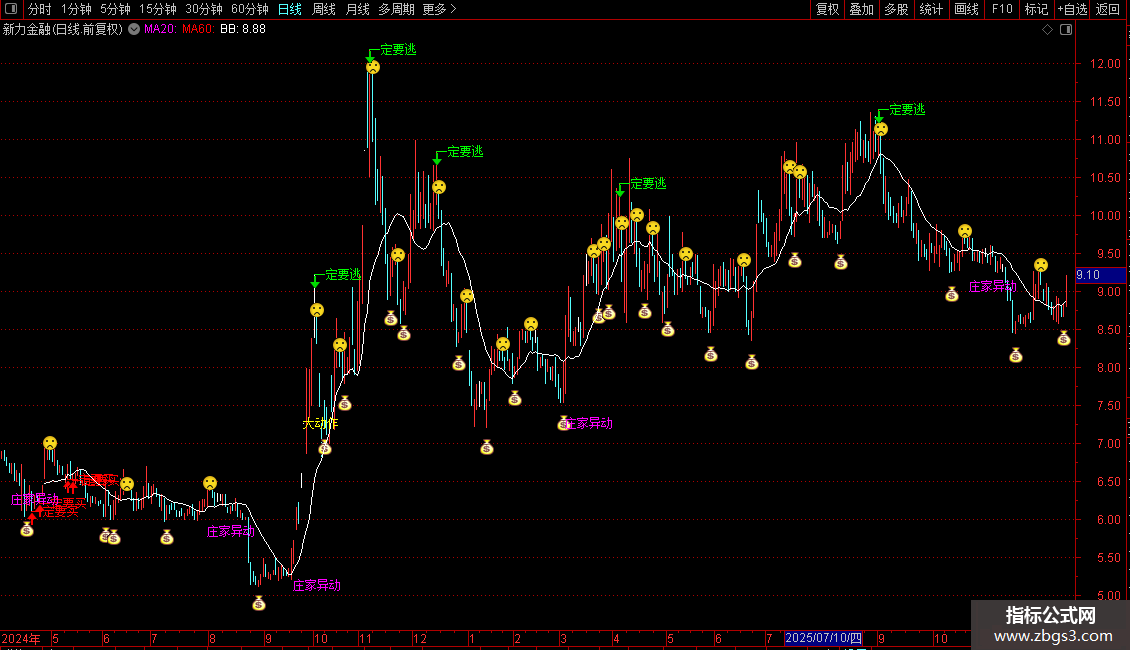 DRAWTEXT(VAR11 AND COUNT(VAR11,30)=1,LOW*0.95,'庄家异动'),LINETHICK1,COLORFF00FF;